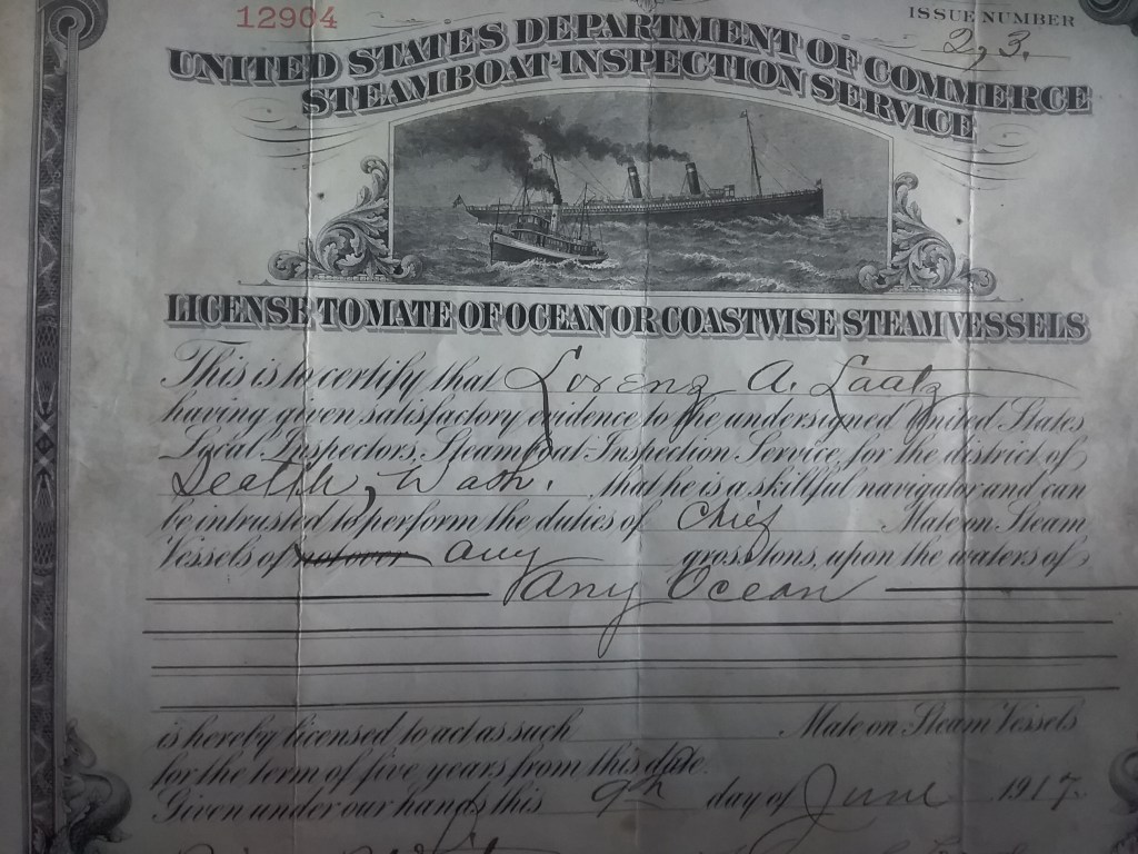 In 1917, Lorenz A Laatz was issued Chief Mate document. Any gross tons and any ocean waters. By the Dept. of Commerce. Long before the USCG took over.